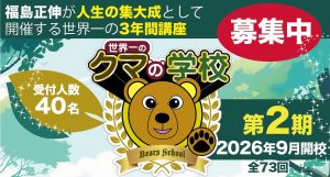 【開校に当たって】 福島正伸です。 世界一のクマの学校・第2期をいよいよ始めることにいたしました。 一緒に学ぶだけでなく、一緒に体験して感動し、独自の価値を創造しながら一緒に成長し続け...